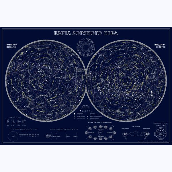 Карти Зоряного неба (Північна і Південна півкулі) подають основну інформацію про зорі та сузір’я. На картах позначені найяскравіші зорі з назвами, сузір’я з назвами, галактики, туманності, кулясті та розсіяні скупчення. Сузір’я відображені художніми малюнками, що робить видання естетично привабливим. Карти півкуль Зоряного неба можна використовувати як навчальний посібник, а також як стильний елемент декору оселі чи офісу.