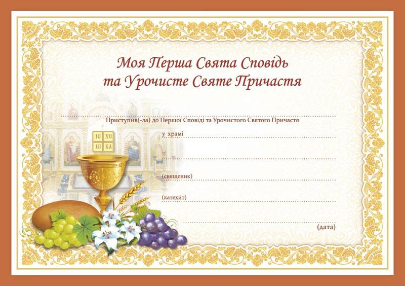 Свідоцтво “Моя Перша Свята Сповідь та Урочисте Святе Причастя”